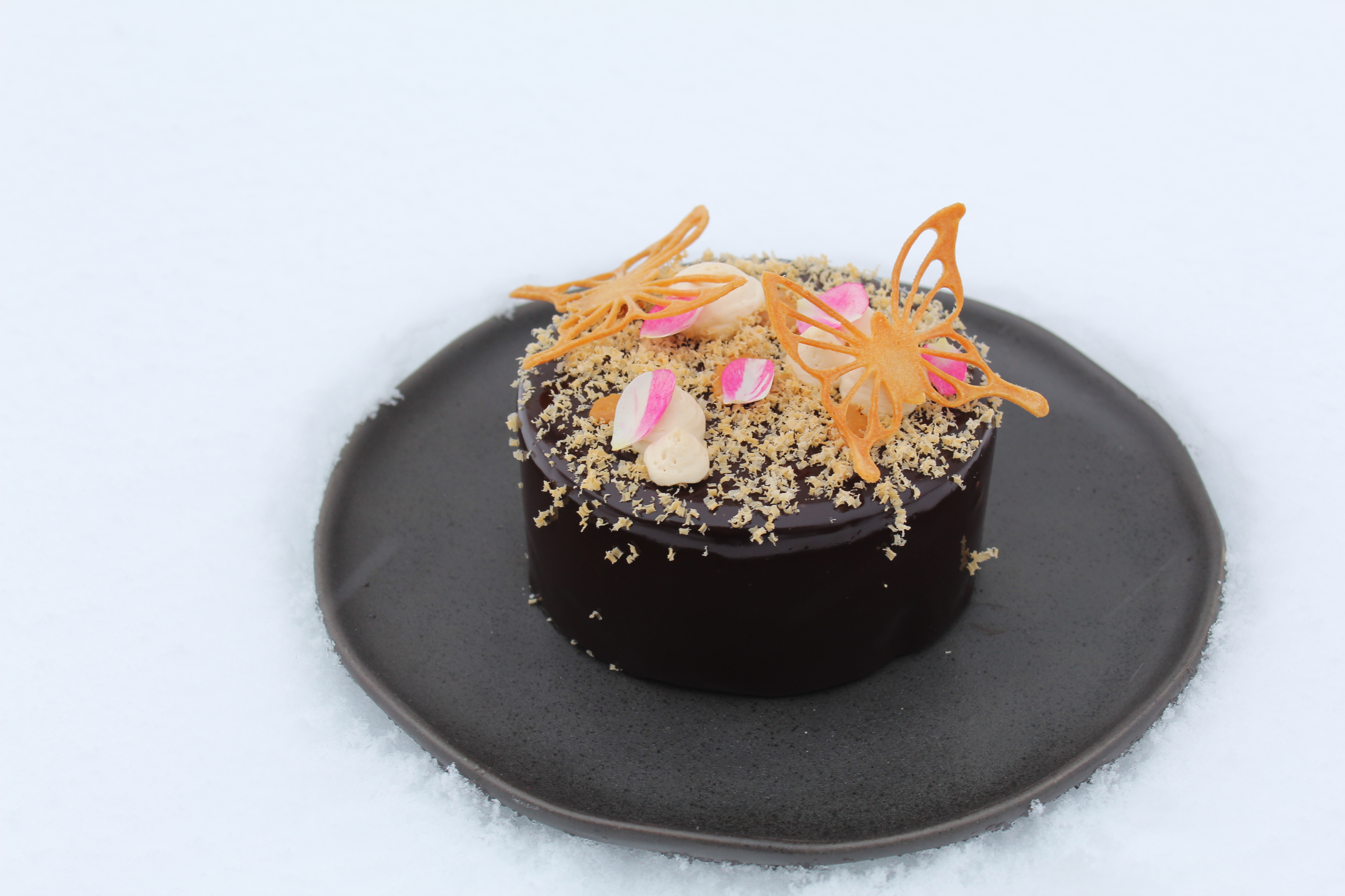 Laissez-vous tenter par une douceur irrésistible et une pure magie. Savourez un délicieux Butterfly Chocolate Cake aux saveurs de cacahuètes, de caramel et de chocolat, inspiré par le pâtissier local Mathias Dogon d'Alpe d'Huez.